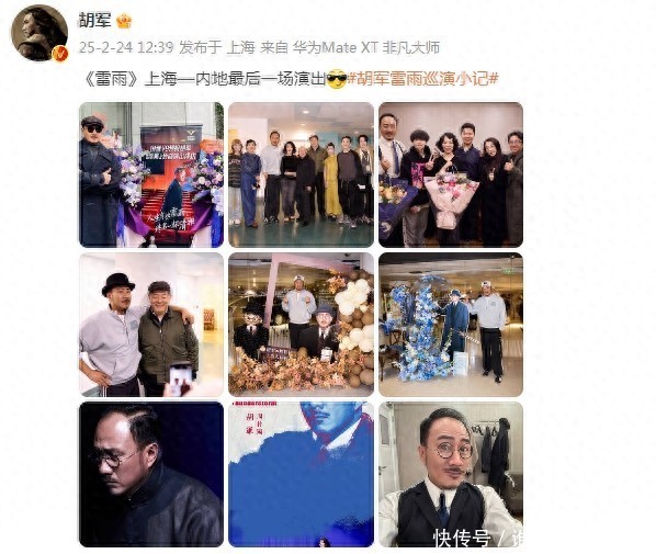 下图是胡军晒出的后台大合照,合照中他和爱妻卢芳及一众小伙伴开心同框。大家伙儿对着镜头笑得非常开心,画面很是温馨有爱。